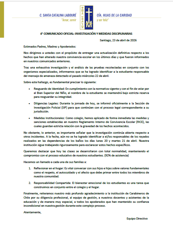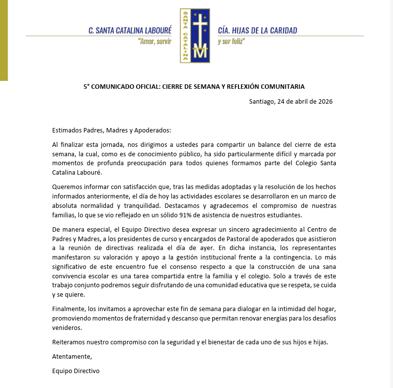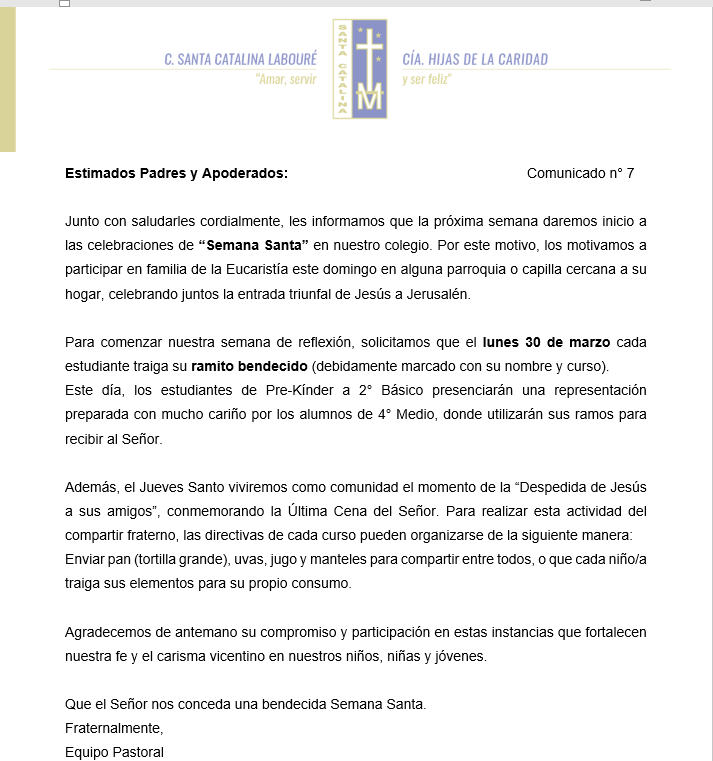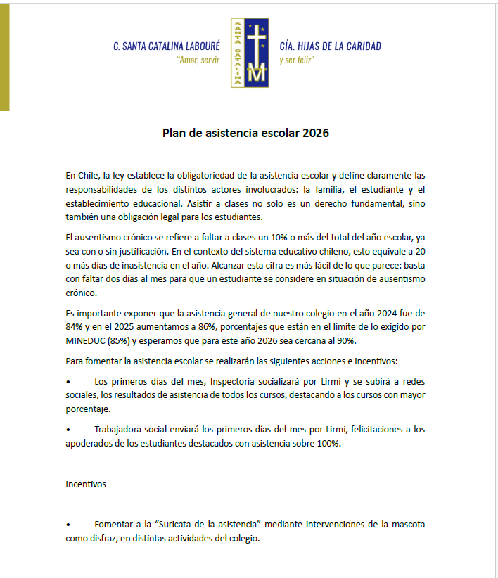 Nos complace darte la bienvenida a la página oficial de nuestra comunidad educativa, Santa Catalina Labouré. Aquí encontrarás información relevante sobre nuestras actividades, proyectos y valores que guían nuestro día a día. Nuestro compromiso es ofrecer una educación integral basada en los principios católicos, fomentando el desarrollo académico, espiritual y personal de cada uno de nuestros estudiantes.