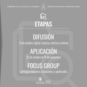 El motivo del presente es darles a conocer que durante los meses de octubre y noviembre, estaremos llevando adelante un Diagnóstico de la Clase de Educación Religiosa que se imparte en nuestros Centros Educativos a lo largo del país, de acuerdo con los lineamientos y orientaciones de las Hijas de la Caridad y del Ministerio de Educación respecto a este tema, apoyados por El Instituto Escuela de la Fe de la Universidad Finis Terrae.